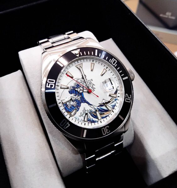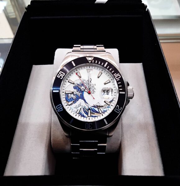 CUSTOM-ORDER-WATCHカスタムオーダーウォッチ 2025.10.02 ルノータス『葛飾北斎』の文字盤 ご注文ありがとうございます😊 今回お客様にご注文頂いたのは、日本美術の中で、世界的に最も有名な作品葛飾北斎の「冨嶽三十六景 神奈川沖浪裏(ふがくさんじゅうろっけい かながわおきなみうら)」の文字盤を用いたオーダーです😆 ベゼルはブラック、バンドはメタルバンドにしアクセントに秒針は赤にしました🎶 ご本人様もご満足😆の素敵💐な仕上がりになりました.