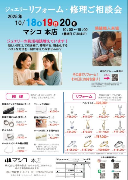 JEWELRY-REFORMジュエリーリフォーム 2025.10.06 ジュエリーリフォーム・修理ご相談会 マシコ恒例の『ジュエリーリフォーム・修理ご相談会』を、4ヶ月ぶりに開催します😊 古いデザインのリング💍のリフォームや、ネックレス・リングの切れ、サイズのお直し、石が外れて無くなってしまった😭😭など、何でもご相談下さい😊 熟練職人の来場は3日間限りとなりますので、修理やご相談がある方は是非この機会にご来店してみてはいかがですか❓ お見積りは無料ですので、ご来店頂きスタッフに声をかけて下さいね🎶