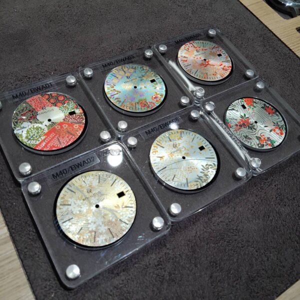 BLOGブログ 2025.09.19 古都『奈良』から生まれた日本伝統の和柄を用いた美しい文字盤 ルノータスが設立された頃から、 日本古来の和柄を取り入れたモデルを生み出したい❗ という思いから作られた文字盤。 日本古来の色彩豊かな色合いを出すために試行錯誤が重ねられ インクや地盤にこだわってつくられています😊 デザインは全6種類、それぞれ日本伝統の柄と色味を感じさせる文字盤になります😉✨ 店頭に実際に使用される和柄文字盤のサンプルが展示されていますので、 和柄の美しさをご覧いただければと思います✨