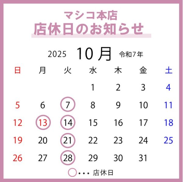 INFORMATIONINFORMATION-お知らせ- 2025.09.22 マシコ本店 10月店休日のお知らせ 本店は、定休日の火曜日以外に10月13日(祝)にもお休みをいただきます。 ヨークパーク店は休まず営業いたします。